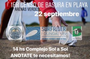 El 22 de septiembre en Arenas Verdes, en el marco del Día Internacional de Limpieza de Playas, a las 14 hs en Complejo Sol a Sol se procedió a realizar en conjunto con Fundación Vida Silvestre Argentina y Surfrider Argentina Arenas Verdes, un censo de basura en playa para evaluar la cantidad y calidad de elementos que llegan a nuestras playas para poder así encaminar acciones concretas para su solución.