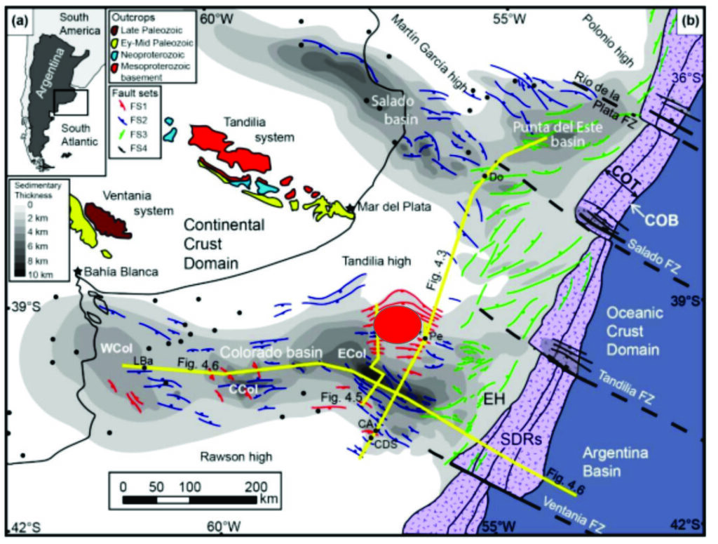 Mapa de estructuras del margen continental con detalle de las cuencas del Salado y Colorado