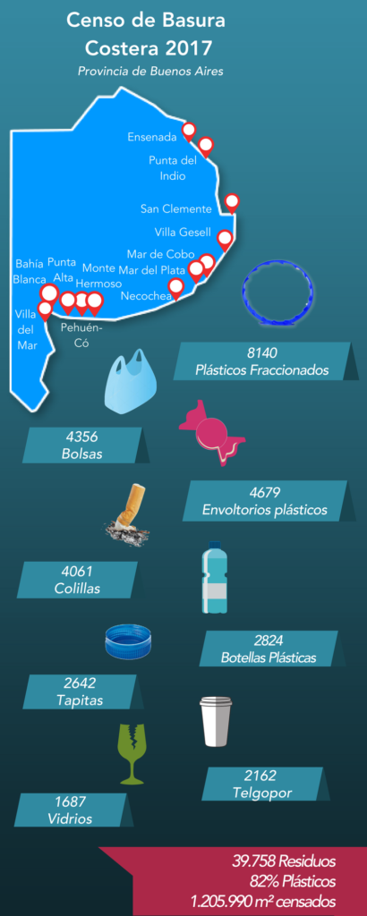 En 1.2 millones de metros cuadrados de playas de la provincia de Buenos Aires fueron recolectados casi 40 mil residuos no orgánicos de los cuales el 82% corresponde a plásticos. Los residuos más habituales: plásticos ya fraccionados por la acción mecánica conjunta del sol, las mareas y la arena, diferentes tipos de envoltorios, bolsas, colillas de cigarrillos, botellas plásticas y tapitas.